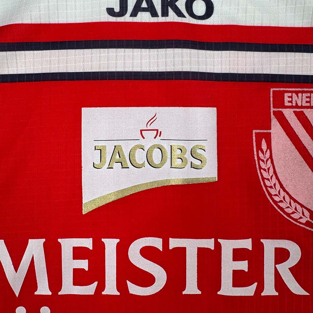 Besonderheiten: In diesem Trikot sicherte sich der Energie Cottbus am letzten Spieltag der Saison 1999/00 seinen ersten Aufstieg in die 1. Bundesliga mit einem Sieg gegen den 1. FC Köln. Unterschrieben von Rekordspieler und Vereinslegende Detlef Irrgang.